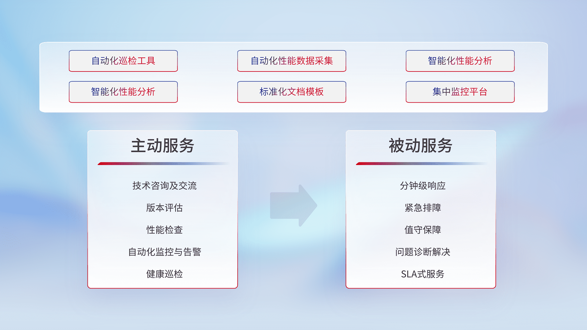 智能化工具和标准化文档,,,,保障服务质量,,,,提供主动服务(包含技术咨询、、、版本评估、、、、性能检查、、、自动化监控与告警、、健康巡检)和被动服务包含(分钟级响应、、紧急排障、、、值守保障、、、、问题诊断解决、、SLA服务)。。